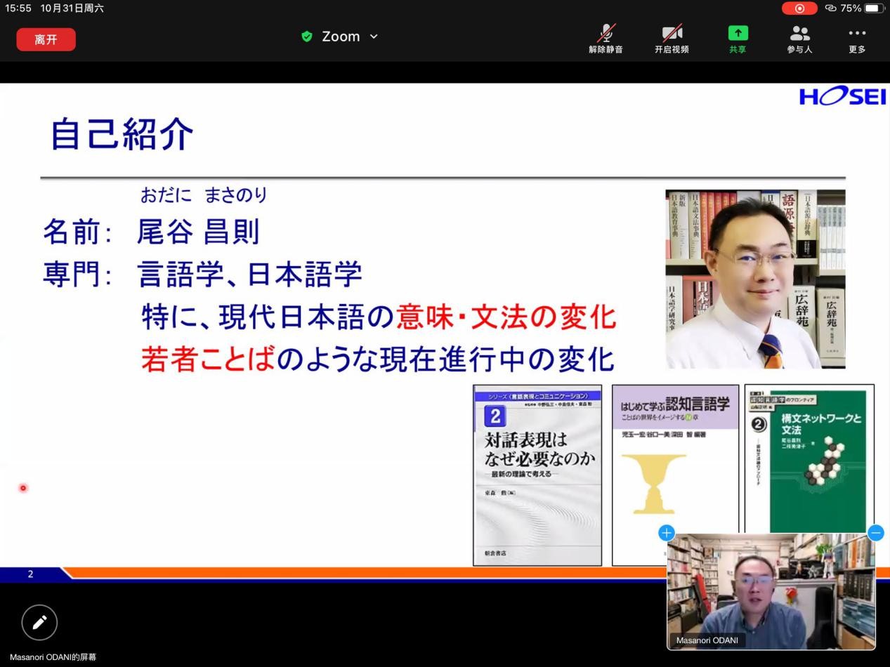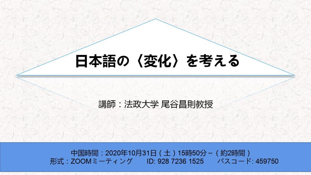 2020年10月31日下午16点,日本法政大学尾谷昌则教授通过ZOOM平台进行了以「日本語の〈変化〉を考える」为主题的线上讲座。讲座由日本法政大学小秋元段教授主持。本次讲座尾谷教授主要围绕“日语的变化”这一主题,介绍了年轻人使用词汇的定义、特征以及网络隐语。我系专业教师和部分研究生、本科生在线参加了此次讲座。