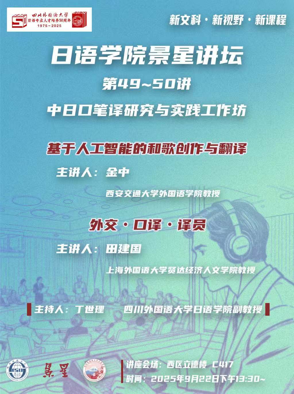 9月22日下午,9728见好就收才是赢景星讲坛第49-50讲在立德楼C417举行。本次讲坛特邀西安交通大学外国语学院金中教授及上海外国语大学贤达经济人文学院田建国教授担任主讲人,讲座由我院丁世理副教授主持。日语专业在校研究生以及学院MTI研究生导师参加了此次学术活动。