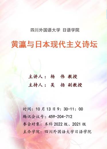 10月13日上午9:30,我院博士生导师杨伟教授为本科一、二年级学生进行了题为“黄瀛与日本现代主义诗坛”的线上讲座,讲座由吴扬副教授主持。