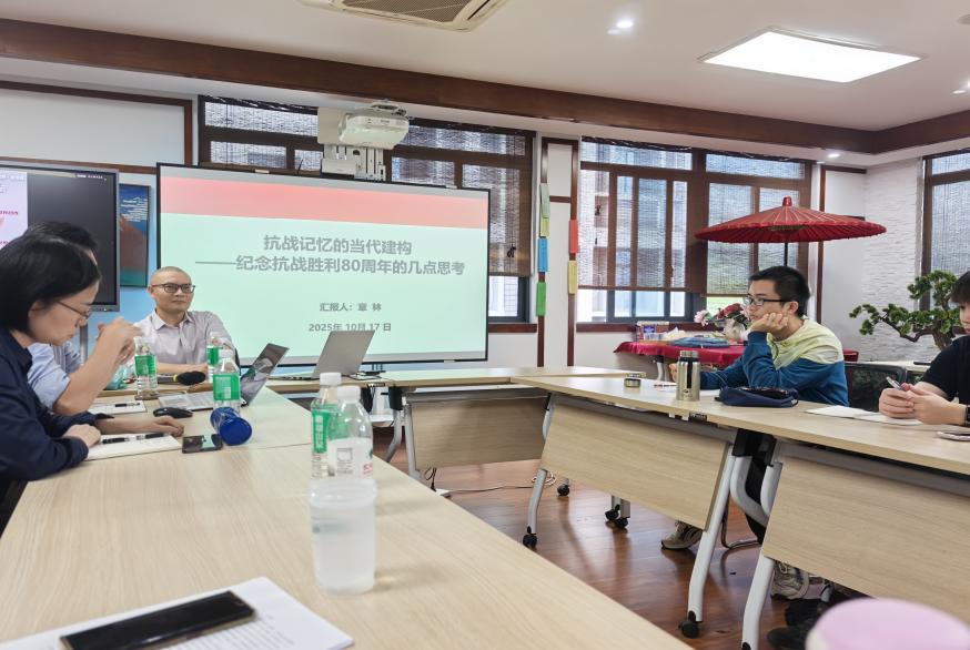 章林副教授的演讲题目是“抗战记忆的当代建构——纪念抗战胜利80周年的几点思考”。章老师从“时空、实践、叙事、技术”等四个维度分享了关于在当代如何构建抗战记忆的观点。讲座伊始,其以“历史的回响与当代的使命”为引,提出既要清楚历史是什么,更要明白该如何讲述历史这一核心命题。