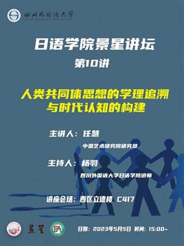 本次讲座的题目为“人类共同体思想的学理追溯与时代认知的构建”。讲座分四个部分:共同体的缘起、中国文化视域中的“共同体”、人类命运共同体思想及认知调查报告、日本的高知人群对共同体认识的特征分析。