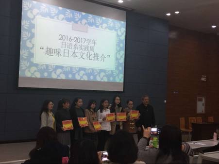 在轻松愉快的氛围中,“趣味日本文化推介”活动圆满的结束了。在活动中,同学们积极参与,既丰富了日语专业知识,也增加了对日本文化的了解。评委老师们为获奖的同学们颁发了奖状。获得肯定的同学们高兴的和吴兴华书记、黄芳老师合影留念。