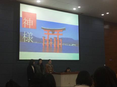 首先上场的是2016级的新生们,一年级同学日语学习才刚刚起步,他们的推介不要求使用日语,旨在培养他们了解日本社会相关的知识,产生兴趣和稳定专业思想。从4个小组分别向大家推介自己选择和感兴趣的从女儿节到鬼神、从侘寂到日本高速公路,都充满了趣味性和美感。尤其是二班刘宗源和白玛央金同学,作为一年级学生全程用日语介绍了日本高速公路,以其流利标准的发音赢得了评委老师们青睐,最终获得了一年级组的一等奖。