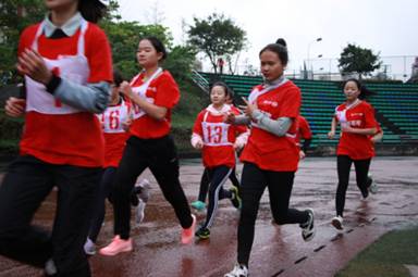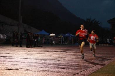 随后的百米赛跑时,日语系女生们小小的一米五多的个子跑起来双脚翻得飞快,最终,殷慧莹同学以小组第二名的成绩进入女子100m决赛并成功取得总排名第八名的良好成绩。男八百米长跑、跳高跳远铅球比赛…每一个场地都有着我们日语系运动员的身影。最后进行男子一千米决赛时,雨不但没有停下的意味,反倒是下得更大。此时时钟却已经指向了傍晚6点,可我们的运动员在弥漫着寒冷的夜色中继续在奋力冲刺,即使穿着短裤还是让我们看到他全身力量的迸发,冲向终点那一刻迎来了一直陪伴在周围的日语系啦啦队员们的声声祝贺和鼓励。朱恩泽同学在男子1000m比赛中荣获小组第二。陈丽媛在女子800m比赛中拿到了小组第三的好名次。其他运动员也都在自己的比赛项目中展现出了自我风采。