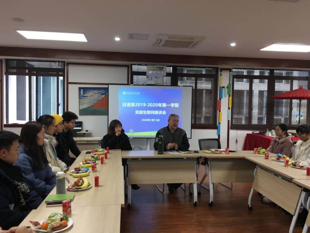寒假将至,秉承着关心、关爱学子的优良传统,1月13日下午2:30在办公楼C417日本文化体验室召开了本学期贫困学生慰问座谈会。日语系学工队伍吴兴华、辅导员金晶、黄竞瑶与来自本科一、二、三、四年级的胡忠杰等20名贫困学生代表进行了座谈交流,为贫困学生送上慰问品和诚挚的新年祝福,让贫困学生在寒冬中感受来自院系组织和老师的深切关爱和春天般的温暖。