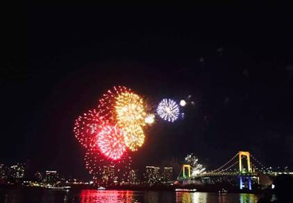 2017年元旦特地去了东京台场看烟花。台场是日本首都东京指定燃放烟火的地方,那时面海填起的陆地。海洋性气候的日本12月冬季是非常寒冷的。我记得我们以及俄罗斯、韩国等留学生一块在当天傍晚的冷风中终于等到了开始燃放烟花的7点钟,虽然听说和知道日本烟花以花样多绚烂美而著称世界,心想也不过与国内过年时燃放的烟花爆竹样子差不多吧。嗨,什么叫“百闻不如一见”!只有自己亲眼目睹了东京台场的烟花大会后,才惊诧地发现和明白,原来日本的烟花可以绽放出我在国内不曾见到过心形、蘑菇形、哆啦A梦形、龙爪菊形等花样图案。我深深折服日本人有这么丰富的创意,或许这就是日本的强大之处吧。所有人似乎都忘记了寒冷,纷纷拿出手机、照相机记录下这短暂的十分钟。我们也不例外,不过手机拍下的画面、清晰度始终不如双眼看到的那么美,索性就安静下来用自己的双眼保存这一场烟花大餐的美好记忆。上一张照片来也只能是让朋友们有个大致了解和感觉印象吧。