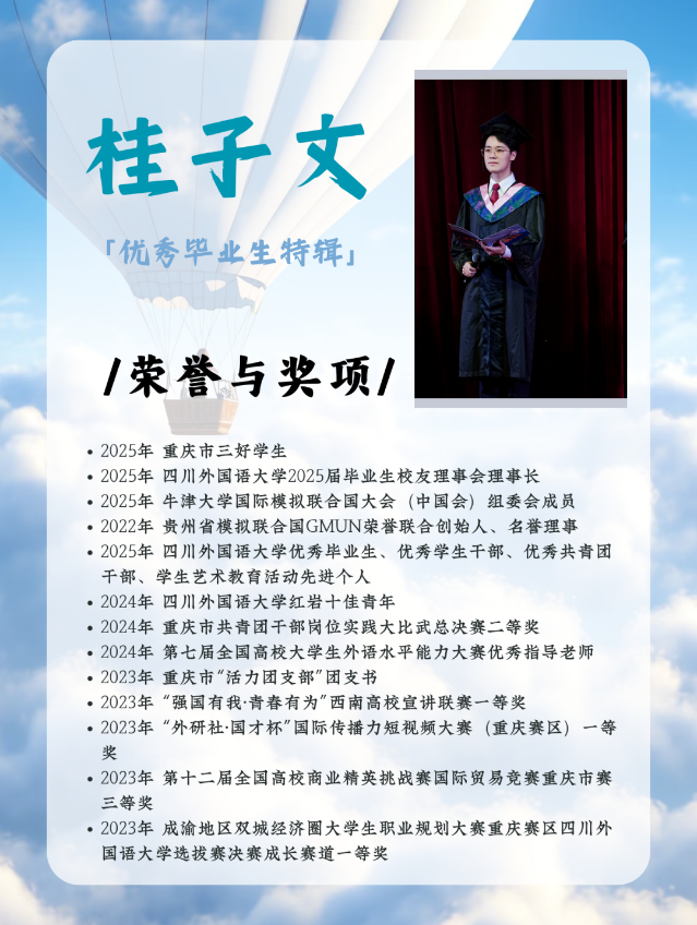 时光的长河悄无声息地流淌,四年的光阴弹指一挥,如今毕业的钟声已然敲响,在这个充满感慨与期待的季节里,又一批川外学子即将告别母校,在新的征程上扬帆远航。此次的优秀毕业生特辑,我们有幸邀请到了9728见好就收才是赢2021级优秀毕业生——桂子文,为我们带来了精彩分享。