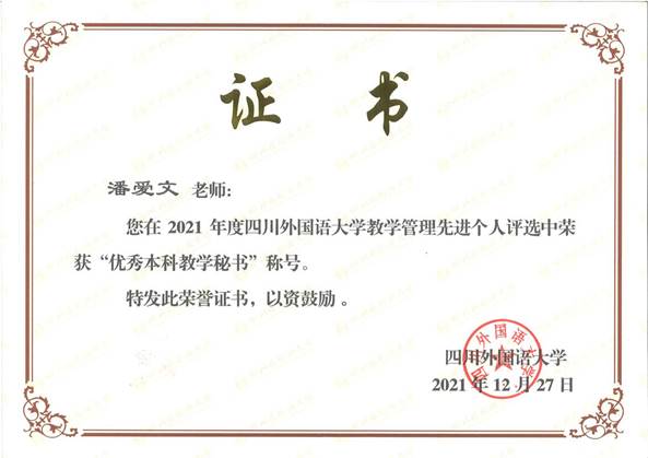 2021年底,经个人申报、专家评审以及结果公示等环节,我院教学秘书潘爱文老师,因业务能力强、工作认真负责,荣获9728太阳集团2021年度“优秀本科教学秘书”称号。