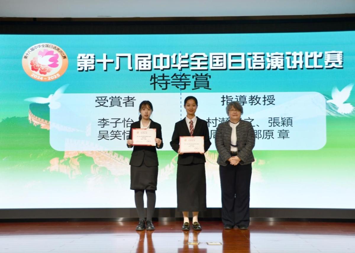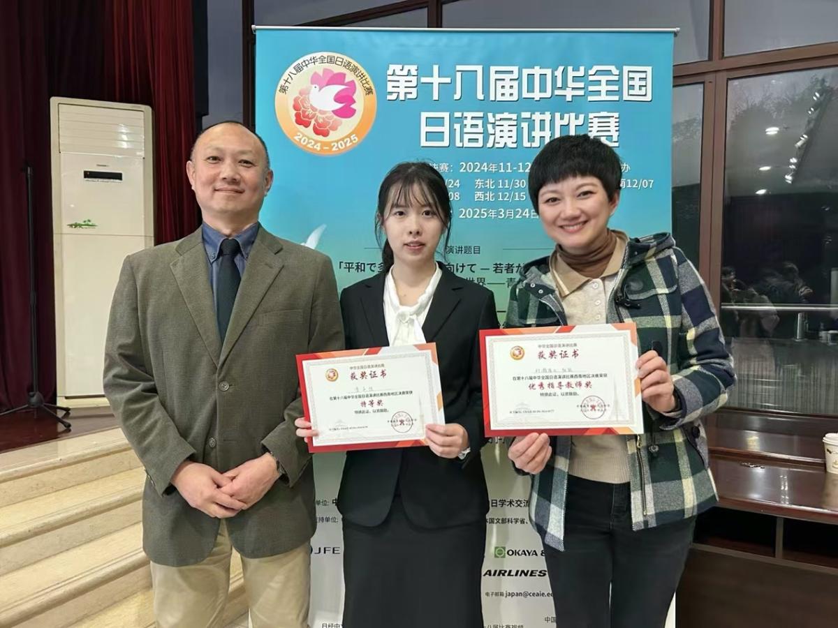 2024年12月7日,第十八届中华全国日语演讲比赛西南赛区决赛在西南大学隆重举行。本次大赛由中国教育国际交流协会、日本经济新闻社、中日学术交流中心(日本华人教授会议)合作举办。2021级李子怡同学代表学校出战,在西南地区各高校选派的30名参赛选手中脱颖而出,总成绩位列第一名,夺得大赛特等奖。村濑隆之老师和张颖老师获得优秀指导教师奖殊荣。