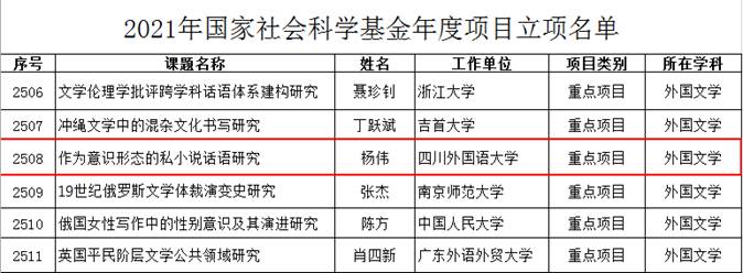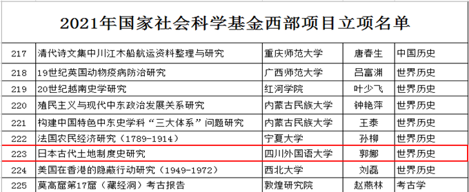 2021年9月3日,全国哲学社会科学工作办公室公布了2021年国家社科基金年度项目、青年项目与西部项目的立项名单。我院博士研究生导师杨伟教授主持申报的《作为意识形态的私小说话语研究》获批此次国家社科基金重点项目,这也是两年内,我院第二次获批国家社科重点项目;另,我院青年教师郭娜老师主持申报的《日本古代土地制度史研究》也获批了此次国家社科基金西部项目。今年,两位老师同时入选国家社科基金项目,是我院不断推进师资队伍建设与学科建设取得的显著成果。