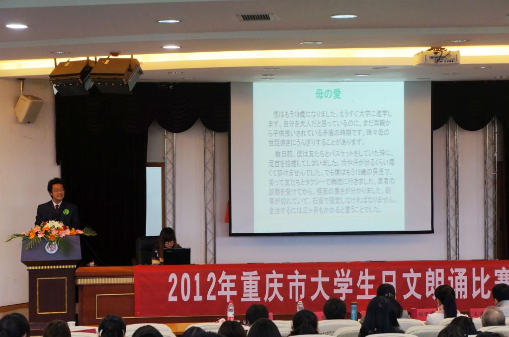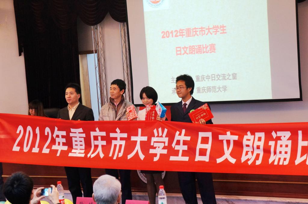 2012年11月6日,在重庆师范大学举行了第三届重庆市大学生日文朗读比赛,本次比赛由重庆中日交流之窗主办、重庆师范大学承办。重庆师范大学、四川外语学院、重庆大学等多所重庆的高校参与了这次比赛。经过激烈的角逐之后,我校日语系邓凯旋与胡小语两名同学力拔头筹,分别获得了二年级专业组和三年级专业组的特等奖,我校日语系连续三年获得二年级组和三年级的冠军,显示出日语系学生的非凡实力。