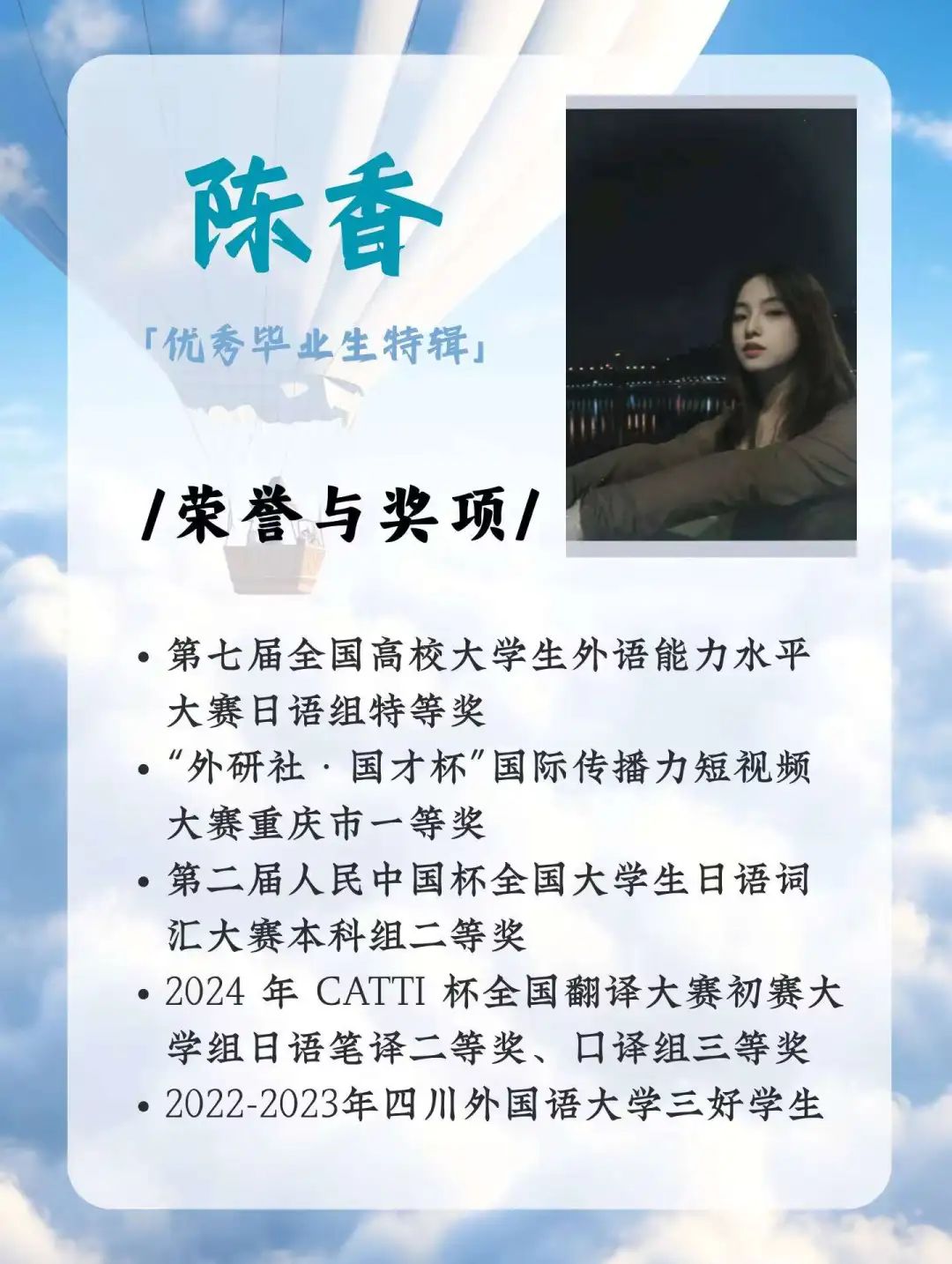 大学四年,陈香积极参加各类比赛。对她来说,比赛不仅仅是为了获得荣誉,更是一个锻炼自己、提升能力的宝贵机会。她回忆起参加日语演讲比赛的经历:“备赛的过程非常辛苦,需要不断地打磨演讲稿、练习发音和语调。但正是这个过程,让我对日语有了更深入的理解,也让我学会了如何在压力下保持冷静和自信。”在比赛中获奖,对陈香来说是一种肯定和鼓励,但即使未能斩获佳绩,她也从不气馁。她认为,每一次比赛都是一次自我审视的机会,通过与其他选手的比较,她能够发现自己的不足之处,从而明确未来的努力方向。“比赛就像是一面镜子,它能清晰地映照出我的优点和缺点,让我知道自己该往哪个方向前进。”她感慨地说。正是这种积极的心态和不断进取的精神,让她在比赛中不断成长,逐渐蜕变成一个更加优秀的自己。