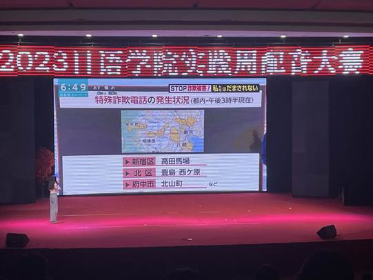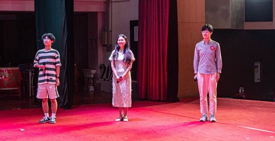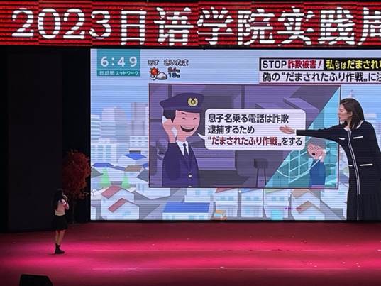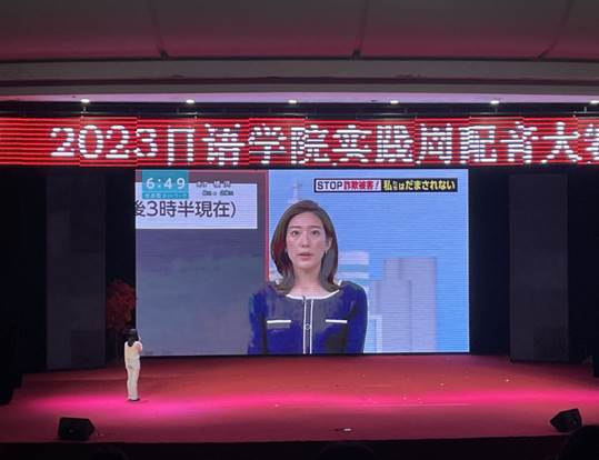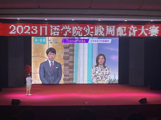首先上场的是新闻类的12组选手。他们不慌不忙,神态自若地在台上站定,仿佛已然把自己当成了日本电视台的新闻主播。随着新闻信息的切换,选手们用标准的发音,恰当的断句与不疾不徐的语速为现场的观众们播报新闻,向在场观众充分展示了他们的日语功底。