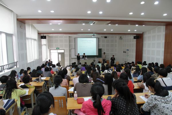 讲座伊始,青木先生介绍到:愉快工学公司旨在开发能使创造者和使用者双方都能体会到电子产品乐趣的制品。并用幻灯片展示出形态、功能各异的机器人,立刻吸引了全场同学的目光。接着,鹭坂先生将自主研发的小鸟形状的通讯机器人 “Coconatch”带到了现场,并邀请同学上台体验“Coconatch”的新颖功能。这款机器人可与电脑连接,能够智能地帮助用户接收和回复信息。随后,青木先生邀请了两名同学试戴了电子猫耳“Necomimi”。“Necomimi”是一款能够感应脑电波的新型电子产品,根据大脑的紧张程度,猫耳可呈现直立、旋转、下垂三种状态。在请现场同学试戴过程中,台上台下同学都充分感受到了该款电子产品的乐趣,欢笑之声不绝于耳。