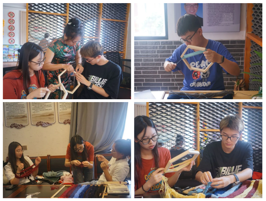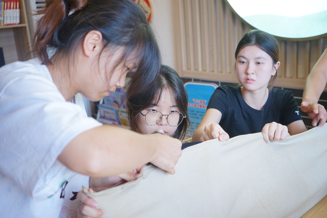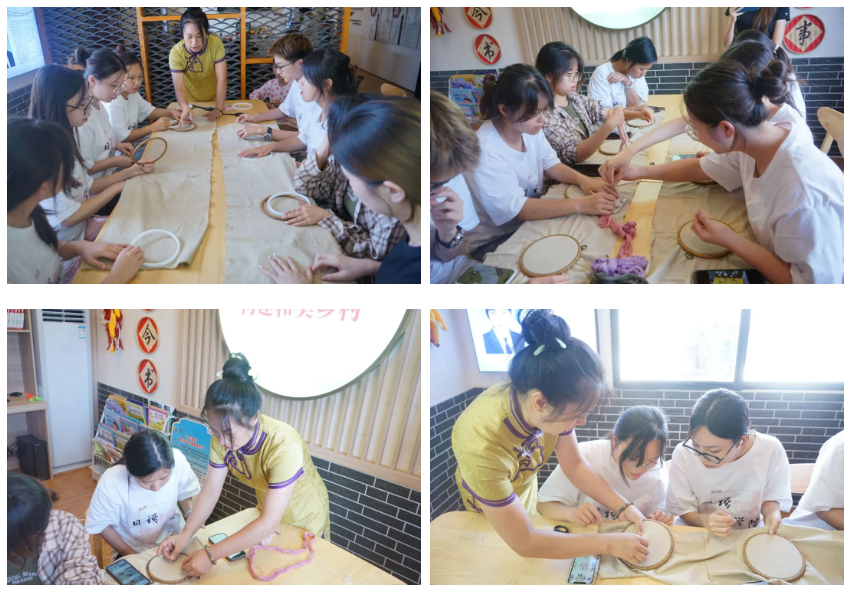 刘老师向我们传授了结籽绣的针法。针线在布间不断穿梭,过程中不乏刺破手指的队员,但大家都没有停下进程。一针一线间,古人追求的和谐之美,映于眼前。