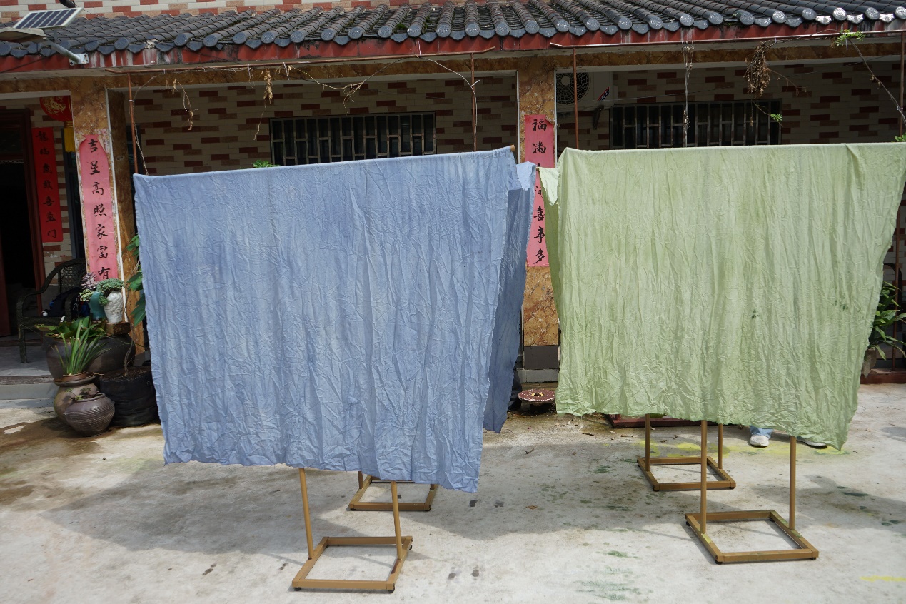 耗时一个上午,大家染出了五块不同颜色与浓度的布,看着阳光下随风摆动的植染布,大家都为自己的成果感到自豪。