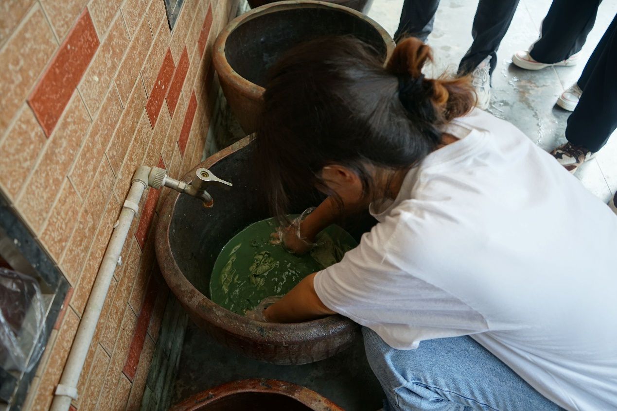 刘老师首先为我们演示了染布的流程。她熟练地将布缠绕、折叠,而后将布浸入染缸中,很快染液就一点点渗透入布中,不一会儿原本淡黄色的素布就染上了漂亮的蓝色。