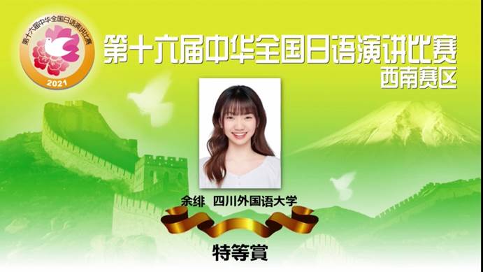 2021年10月24日,第十六届中华全国日语演讲比赛西南赛区预选赛于西南大学举行。2018级余绯同学代表我院出战,在西南地区各高校日语专业派出的32名参赛选手中脱颖而出,斩获“特等奖”第一名。