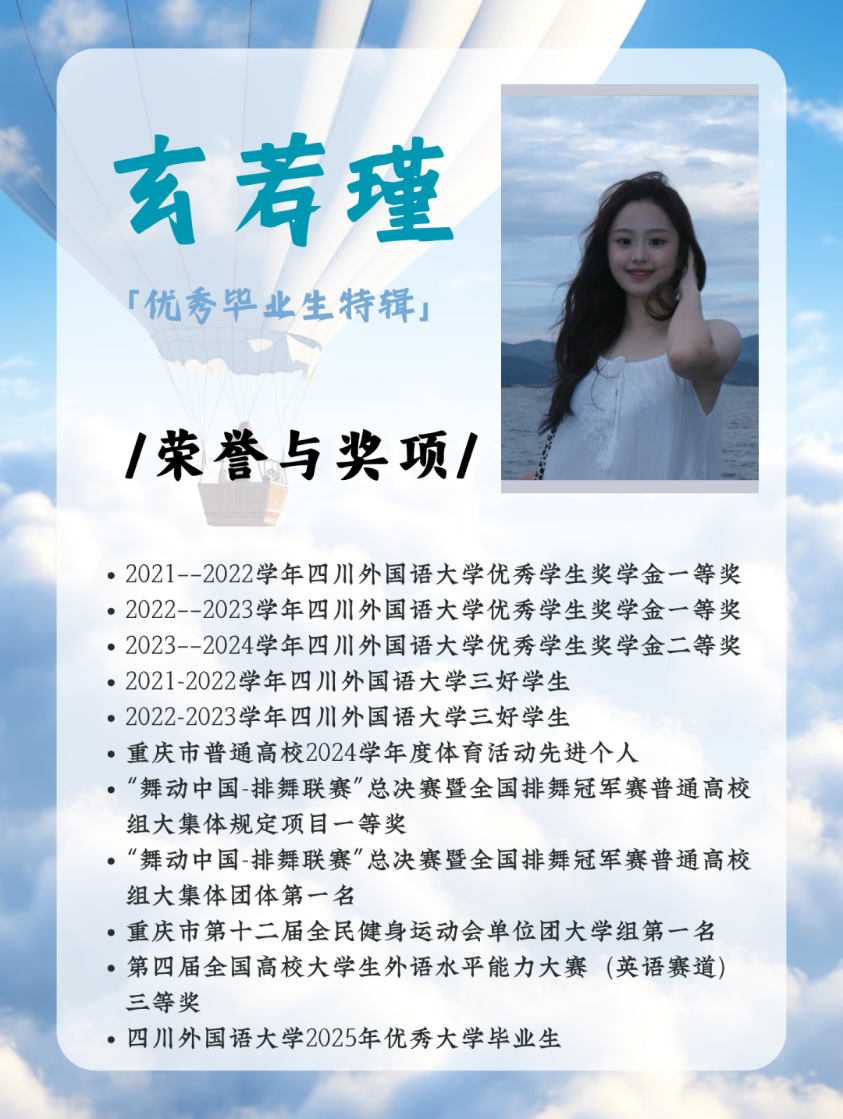毕业季校园,是我们青春的摇篮,是梦想起航的地方。在这里,我们度过了无数个欢笑与泪水交织的日子,结识了一群志同道合的伙伴,遇见了那些引领我们成长的良师。而毕业,就像是一场温柔的告别,既带着对过去的不舍,又满含着对未来的期待。在毕业季这个充满故事与梦想的时刻,本期的优秀毕业生特辑很荣幸能邀请到玄若瑾,为我们带来精彩的分享。