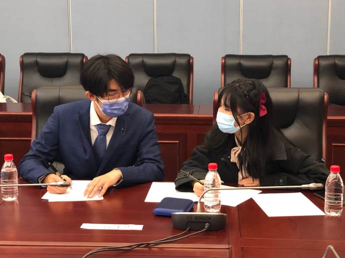 郭俊、詹诗嘉现场写作初级组冠军——王小双和李雯以“信”为线索,将过去的我和未来的我串联起来,传递了想要感恩父母的真挚情感,并通过风趣幽默的自我介绍给评委们留下了深刻的印象。赛后,日本驻重庆总领事馆还通过微博官方账号对初级组冠军王小双、李雯进行了有关日语学习方面的采访。