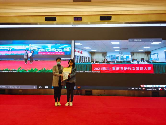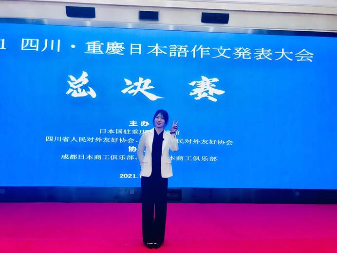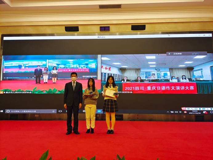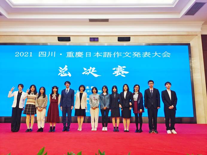 2021年10月30日,由重庆市人民对外友好协会、四川省对外友好协会、日本驻重庆总领事馆共同主办的“2021四川·重庆日语作文演讲大赛”通过线上线下同时进行的方式成功开赛。经过激烈角逐,我院参赛选手李雯、王小双荣获初级组冠军,施双燕、孙璐获得中高年级组亚军,张琳、阳君获得中高级组季军,王珏、刘睿涵,詹诗嘉、郭俊获中高年级组优秀奖,同时我院研究生张晓伋担任了此次大赛重庆赛场的主持人。
