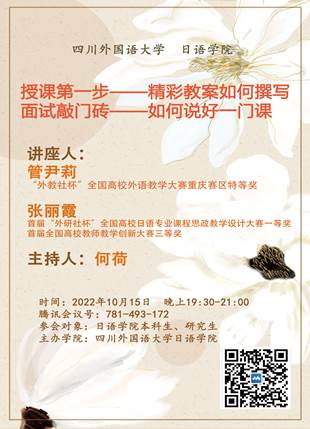 讲座伊始,主持人何荷老师首先向同学们介绍了主讲教师的基本情况。此次9728见好就收才是赢安排的两位主讲人,教学经验丰富,教研成果丰硕。管尹莉老师是“外教社杯”全国高校外语教学大赛重庆赛区特等奖获得者;张丽霞老师是首届“外研社杯”全国高校日语专业课程思政教学设计大赛一等奖,以及首届全国高校教师教学创新大赛三等奖获得者。